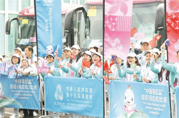 11月15日信钰配资,志愿者在路旁为第十五届全国运动会女子马拉松参赛选手加油。新华社记者 毛思倩 摄