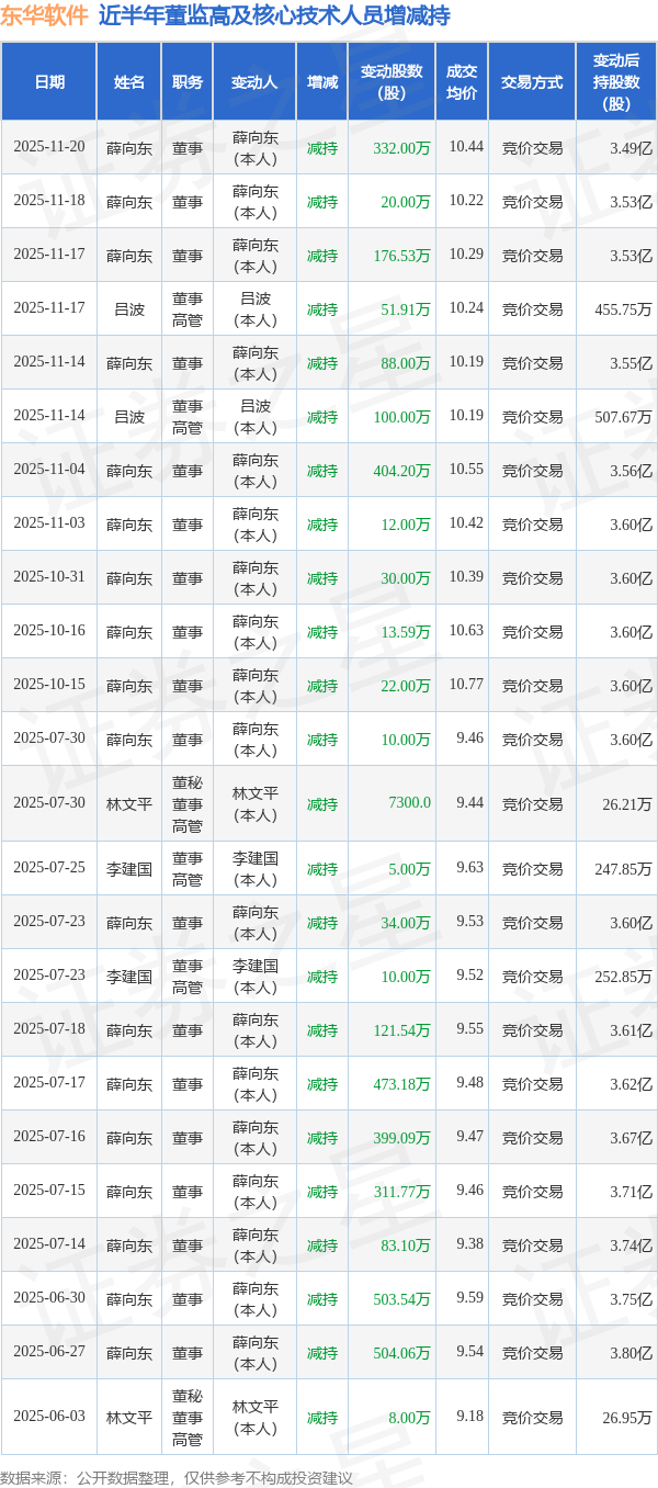 东华软件近半年内的董监高及核心技术人员增减持详情如下: