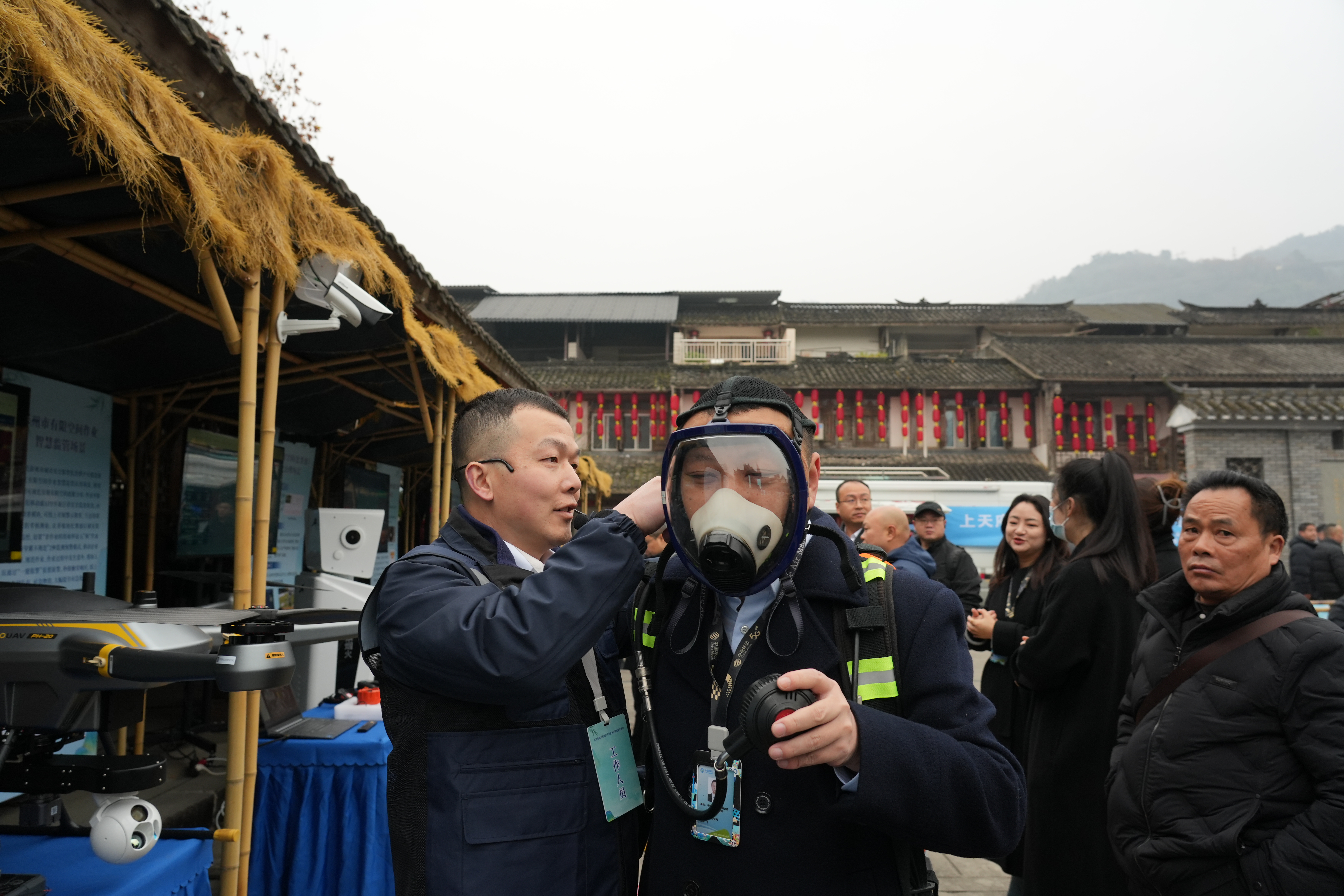专业人员指导群众体验空气呼吸器等装备的使用。应急管理部供图